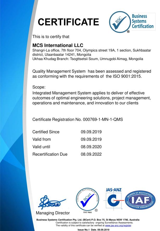 MCS International компанид олгосон BSC-ийн гэрчилгээ.